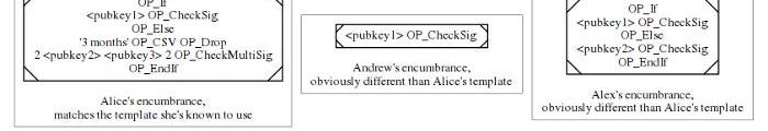 這棵默克爾樹的樹根最終標識了Alice的完整財產條件,而且只有32字節的體積。此后,Alice可以使用一個替代性的條件腳本,聲明:一筆花費交易,只有提供其中一個子腳本連接到默克爾根的證據、并且子程序返回True的時候,才是有效的。
