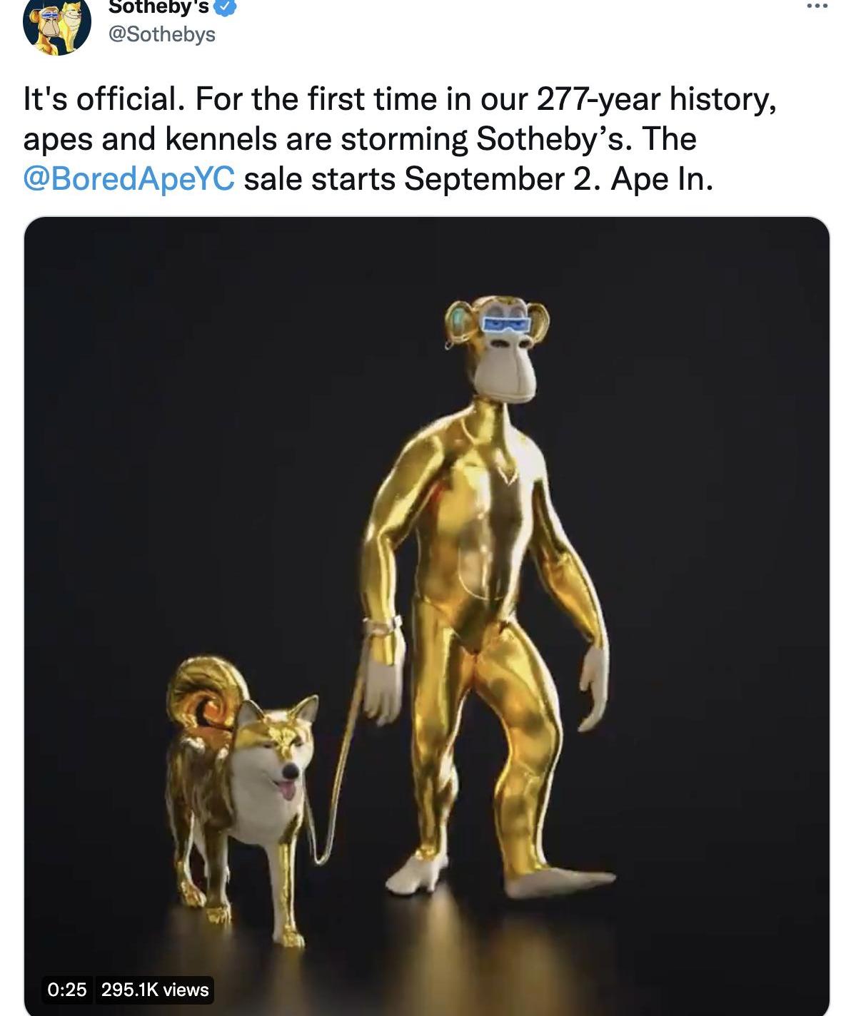 8月28日,蘇富比副總監、當代藝術專家及數字藝術聯席主管MichaelBouhanna在推特上宣布,NFT項目Bored?ApeYachtClub與Bored?ApeKennelClub將于9月2日至9日亮相蘇富比。蘇富比官推甚至將頭像改成了一只金色的猿猴和柴犬,還配上了一小段動畫?。