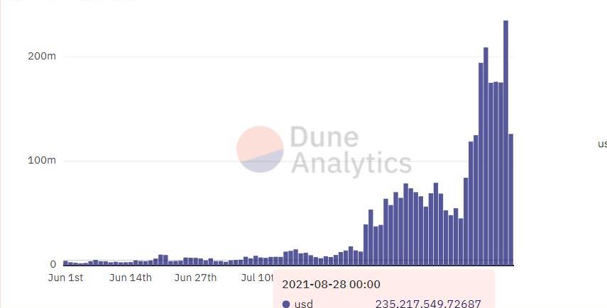 XRP/HKD-2.67%巴比特訊,DuneAnalytics數據顯示,全球最大的NFT交易平臺OpenSea在8月28日單日成交額達2.35億美元,再創歷史新高。這次也是OpenSea歷史上第2次出現單日成交額突破2億美元。截至目前,OpenSea8月總交易額約27.48億美元,為7月交易額的8.5倍。