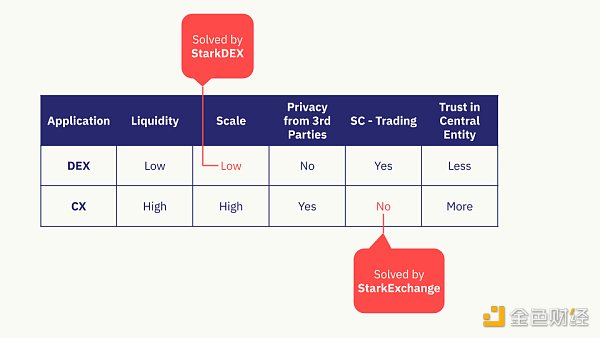 我們最近與0x一起推出了Alpha版的StarkDEX,這是一種用于去中心化交換所(DEX)的擴展性解決方案。下圖是中心化交易所(CX)和去中心化交易所(DEX)在幾個重要方面的比較,以及StarkDEX和StarkEx如何解決它們的主要缺點。