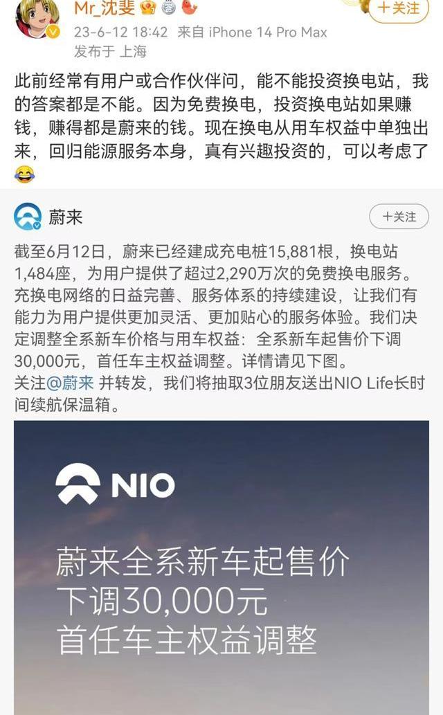 6月12日晚間,沈斐還在微博上喊話:“此前經常有用戶或合作伙伴問,能不能投資換電站,我的答案都是不能。因為免費換電,投資換電站如果賺錢,賺得都是蔚來的錢。現在換電從用車權益中單獨出來,回歸能源服務本身,真有興趣投資的,可以考慮了。”