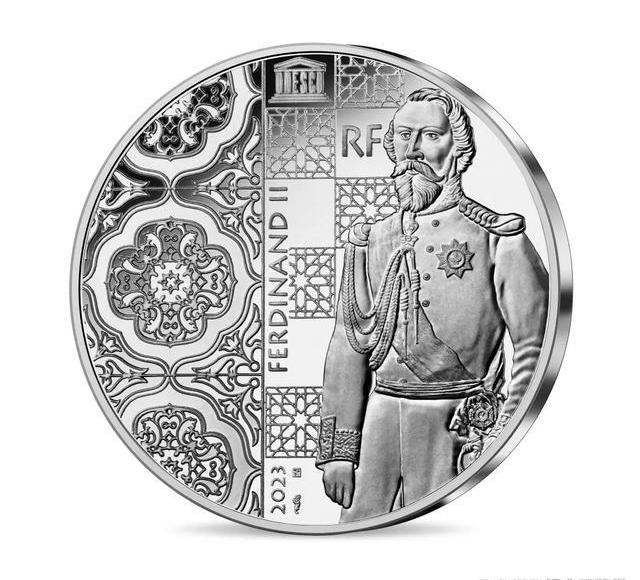 這枚硬幣的正面刻有1837年至1853年葡萄牙國王配偶費迪南德二世的肖像,也是這座宮殿的起源。馬賽克的靈感來自宮殿里的人。聯合國教科文組織標志、“RF”、標志和2023年也出現了。