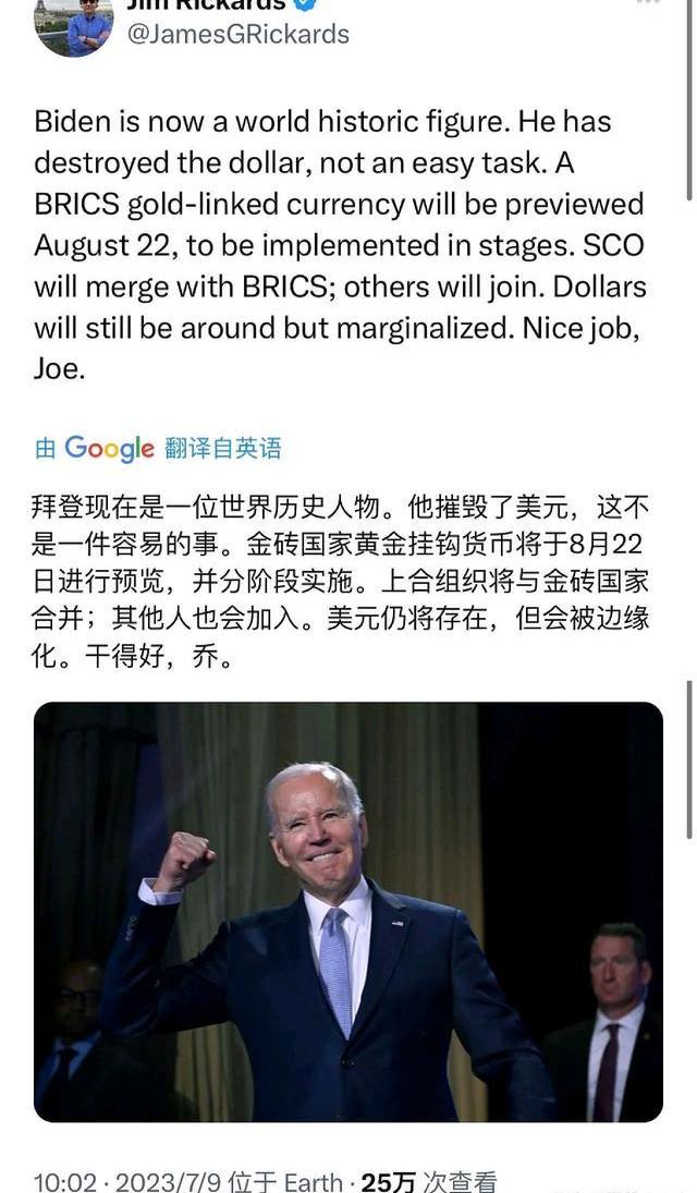 XRP/HKD-2.16%《貨幣戰爭》作者吉姆·里卡茲對美國總統拜登進行了嚴厲的批評,指責他正在摧毀美元。里卡茲先生認為,金磚國家將在8月22日開始預演黃金掛鉤貨幣,并隨后分階段實施。他相信,這將導致美元的邊緣化,盡管它仍將存在。此外,他還提到上合組織可能與金磚國家合并,并吸引更多國家的加入。
