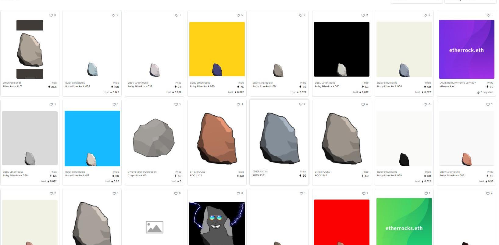 “EtherRock”,這是以太坊上極其知名的NFT項目,其共計有100個NFT,每個NFT是一張石頭圖片,這100塊石頭僅僅在顏色上有一些略微的區別。8月23日,其中一塊石頭以250枚ETH被售出,價值約83萬美元。更早之前,孫宇晨以187枚ETH購入了另一塊石頭。