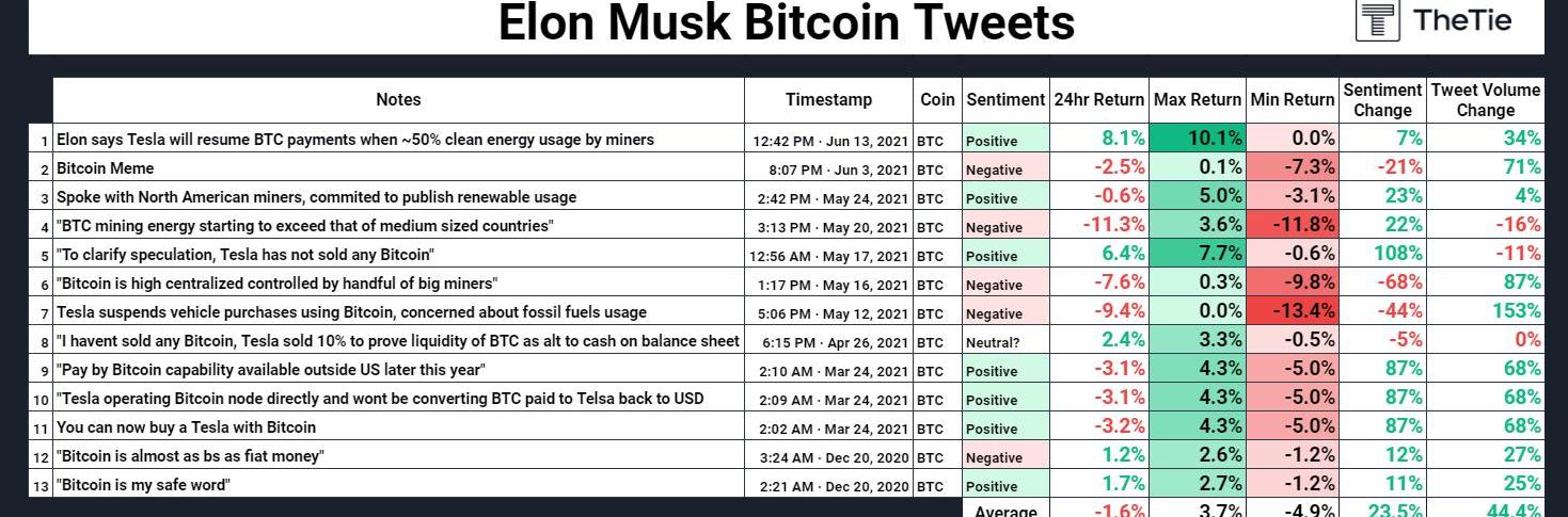 下表顯示了馬斯克所有與比特幣相關的推文,以及一些額外的統計數據,例如24小時/最大/最小回報、推文量變化和情緒變化。這些推文包括特斯拉接受BTC付款、與礦工的談話、Meme等主題。
