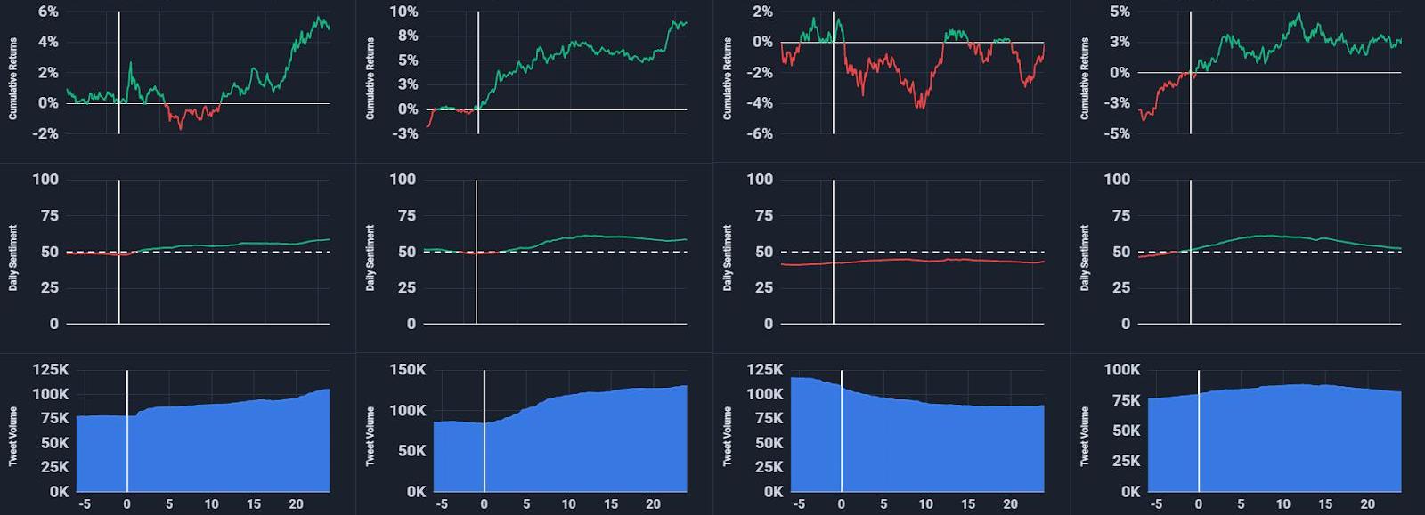 下面的所有三重堆疊圖表評估了從推文發布前6小時到發布后24小時的價格表現、情緒得分變化和推文數量變化。
