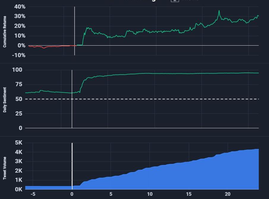 早在2020年,在馬斯克發出一條簡單的推文“一個詞:Doge”之后,DOGE的價格在24小時內飆升了40%。這一瘋狂的價格波動之后,情緒上升了58%,因為TIE的每日情緒得分從61飆升至95。