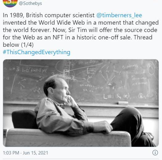 XRP/HKD-2.32%蘇富比拍賣行發推宣布,被譽為發明了互聯網的TimBerners-Lee爵士將在以太坊區塊鏈上創建具有30年歷史的萬維網源代碼的NFT,該NFT將在蘇富比拍賣行拍賣,為期一周,競價從1000美元開始。拍賣所得將通過萬維網基金會捐贈給Berners-Lee和他的妻子Rosemary支持的倡議。