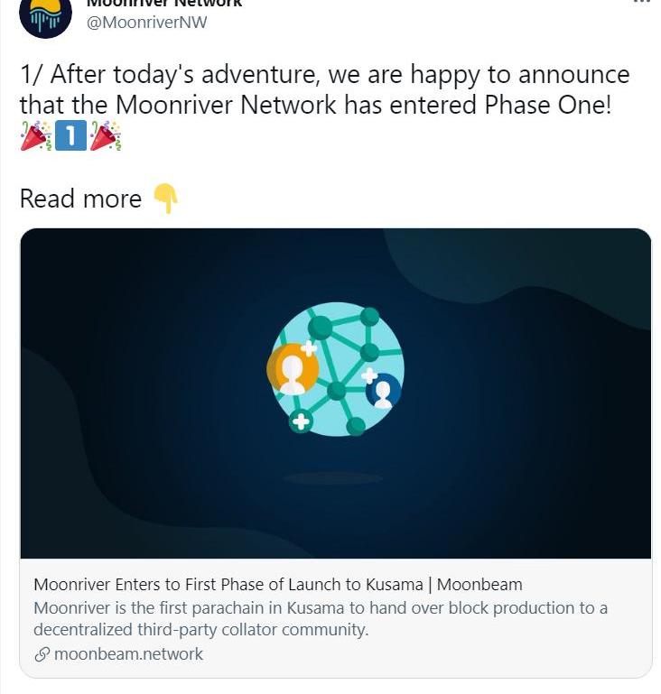 XRP/HKD-5.5%巴比特訊,7月10日,Kusama平行鏈Moonriver發文宣布完成其五階段啟動過程的初始步驟—第0階段技術準備,現已升級至第一階段部署期。據悉,Moonriver完成第一階段的部署工作約需1-2周,此階段將開放更多去中心化功能,如添加收集人節點等。
