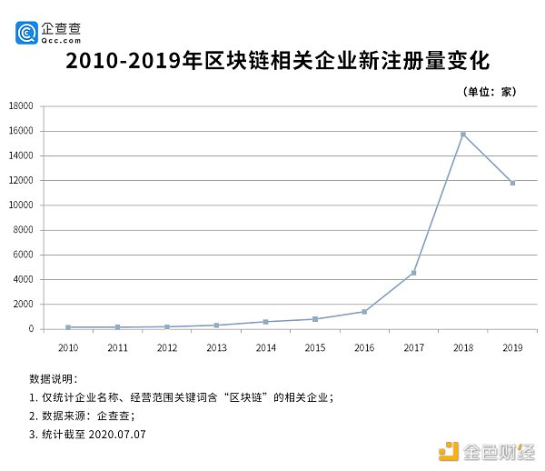 通過截取2010-2019年區塊鏈領域相關企業新注冊變化數據,可以發現2016年開始區塊鏈行業進入上升通道。而隨著比特幣價格在2017-2018年間的瘋漲,整個區塊鏈行業進入井噴模式,連續兩年增長均在200%以上,其中2018年注冊量接近1.6萬家,同比增長了246%。
