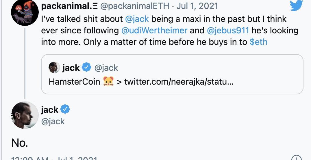 在Twitter推出NFT的消息傳出后,一位自稱為“開發者和投資者”的名為“packanimalETH”的推特用戶發布推文稱,多爾西投資以太坊“只是時間問題”。