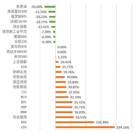 ETH年初至今漲幅高達194.16%。BTC、 BSV、BNB、XRP等加密貨幣也都取得50%以上的收益,遠超主流資本市場。