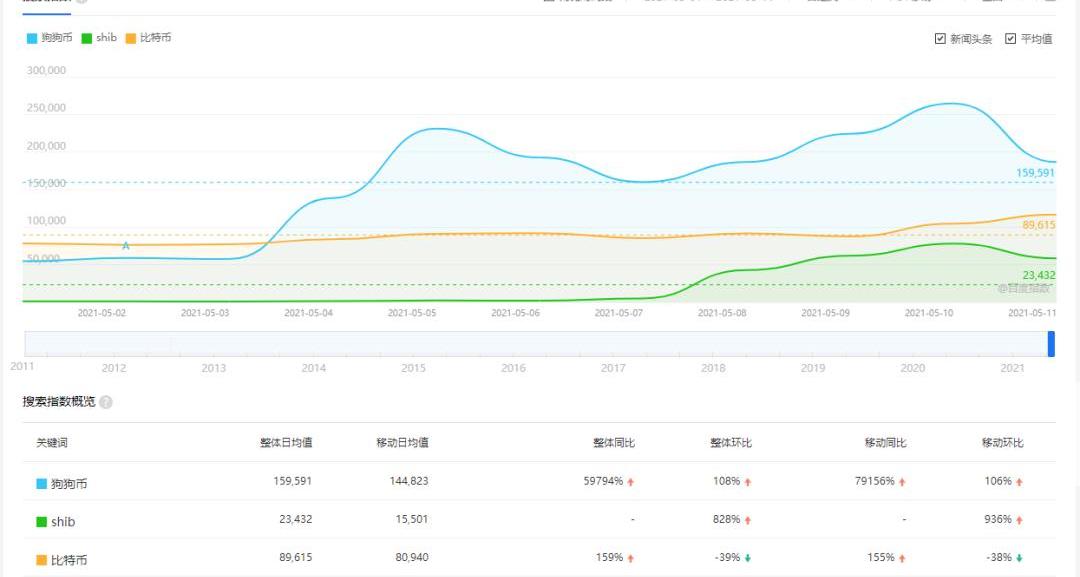 百度搜索指數顯示,狗狗幣和柴犬幣的搜索量近日急劇上升。狗狗幣搜索指數整體日均值突破15萬,整體環比上漲108%。柴犬幣搜索指數整體日均值達到2.3萬,整體環比上漲828%。