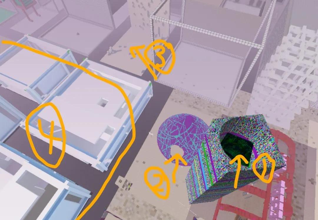 你試著從1的中心位置垂直向下飛到這根旋轉著的柱子的底部,再從底部向上飛入天空;你試試從2的位置進入圓球內部一個旋轉體的中央,站在那兒或快速晃動鼠標;你可以去往3的位置,在3的空間中穿梭一下。