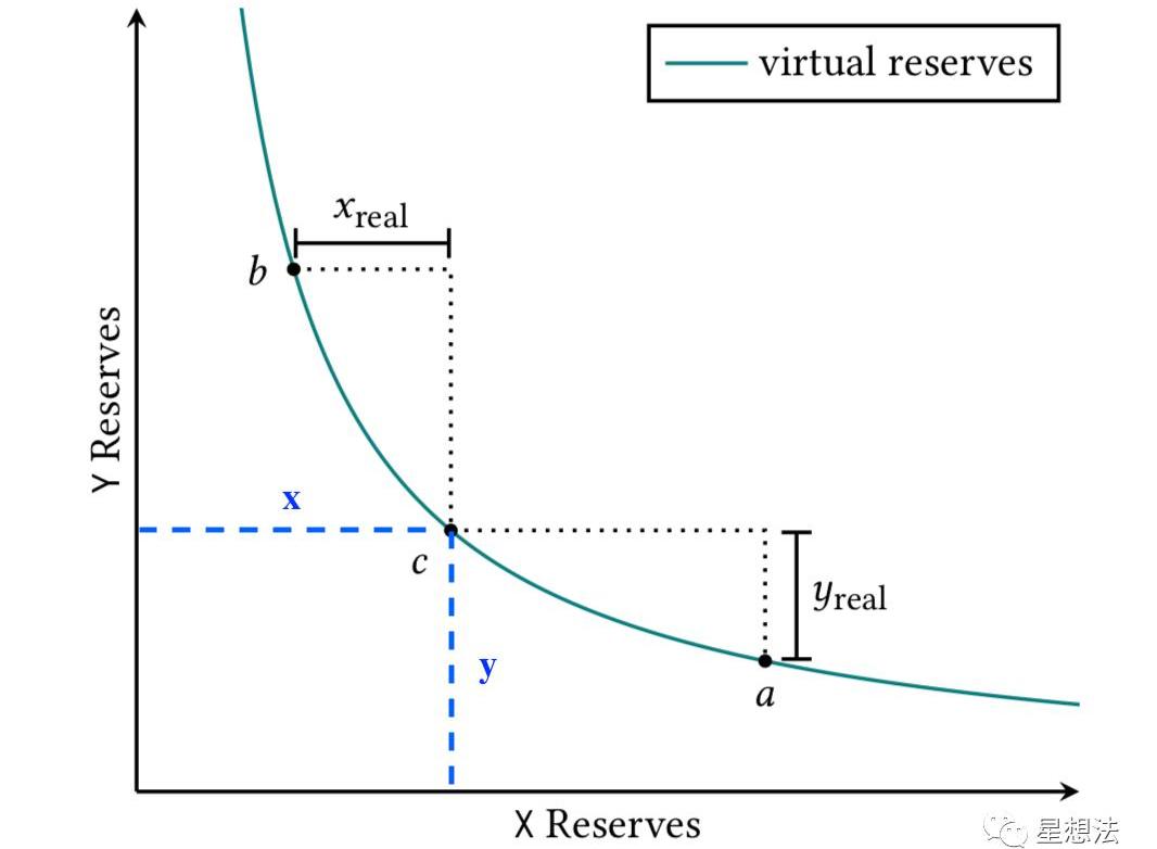 uniswap的交易采用的乘積固定模型(x*y=k)。所謂的虛擬資金池(VirtualReserves),是指還在乘積固定曲線上,只提供某個區間流動性的資金池: