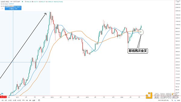 上圖是BTC2010-2020長期周線走勢,圖中兩條關鍵均線是周線MA20和MA50均線,研究可以發現,每次MA20均線上穿MA50均線形成金叉之后,后面BTC都能啟動一波強勢上漲趨勢行情。例如,第一次2012年7月,周線MA20上穿MA50均線金叉向上,后面BTC便開啟了12年的慢牛和13年的瘋牛行情,價格從8美金一路拉升至13年牛市頂點1150美金,歷時490天區間漲幅144倍。第二次便是15年的10月,MA20金叉MA50均線,后面BTC也是步入了16年的慢牛和17年大牛行情,幣價從300美金強勢拉漲至17年牛市頂點接近2萬美金,歷時777天區間漲幅64倍。第三次是19年6月,兩線金叉,價格從8000美金啟動,一路漲至19年小牛頂點14000美金再回落,歷時20天區間漲幅75%,這一次金叉屬于BTC19年趨勢行情的上漲中繼整理階段,蓄勢后價格進一步上行突破。