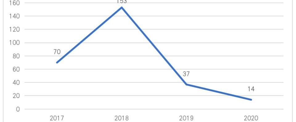 2020年以來,區塊鏈初創企業融資情況更為困難。01區塊鏈、零壹智庫統計了2017年以來中國區塊鏈初創企業的融資情況,發現區塊鏈初創企業的融資時間集中在2018年。盡管1024講話對各地區塊鏈產業發展起到了極大的促進作用,但由于受到2020年新冠疫情及全球經濟下行影響,區塊鏈投融資市場整體較為冷清,包括加密貨幣產業在內的整個中國區塊鏈產業2020年也僅發生81筆融資,公開披露的融資總額僅11.12億元,較上年同期分別下降了54%、57%。而初創企業的融資境況更為艱難。截至2020年12月,我國境內僅有14個區塊鏈初創企業獲得融資,較2019年融資數量同比下降62%。