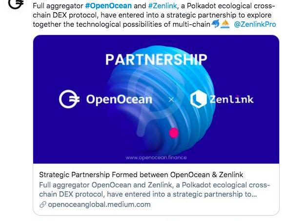 XRP/HKD-6.78%全聚合協議OpenOcean與基于Polkadot的跨鏈去中心化交易網絡Zenlink達成戰略合作,OpenOcean將聚合ZenlinkDEX,為用戶提供波卡生態相關資產的便捷交易入口。此外,Zenlink與OpenOcean均是具備跨鏈屬性的協議,雙方達成合作意在共同探索多鏈聚合技術的可能性。Zenlink是基于波卡的跨鏈DEX協議,目前已完成兩個Web3基金會Grant的交付,并即將在卡槽拍賣期間發布測試網。與Zenlink的戰略合作是OpenOcean向波卡生態聚合邁進的第一步。