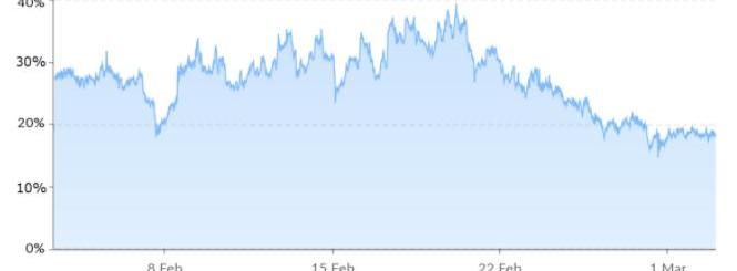 2月19日至2月23日期間,有20億美元的多頭期貨合約進行了清算,占未平倉合約總額的28%。正如之前的恐懼與貪婪指標所描繪的那樣,人們應該預料到市場情緒會顯著惡化。