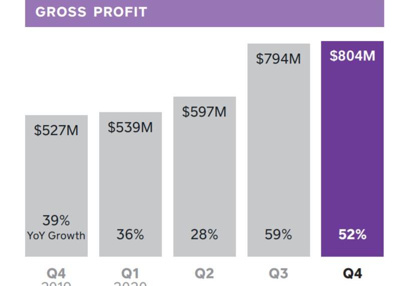 根據20年第四季度財報,Square在第四季度毛利潤達到了8.04億美金,同比上漲52%。其中,SellerEcosysterm帶來了4.27億美金的毛利潤,同比上漲13%;CashApp毛利潤3.77億美金,同比上漲162%。