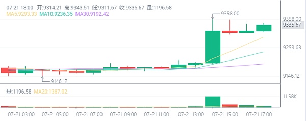 據火幣行情顯示,今日BTC行情整體保持震蕩,下午三點快速上漲,最高觸及9358,隨后開始震蕩。日線圖大幅拉升突破整理平臺,并且突破均線MA30以及幾個9250等重要阻力位,多頭顯強;4小時圖上漲后量能未持續,并形成較大乖離值,局部有回調需求;1小時圖上漲后蓄勢整理,多頭仍有發力空間。