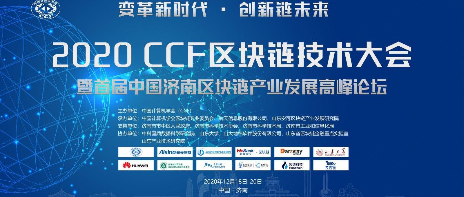 XRP/HKD-2.14%12月18日至20日,2020CCF中國區塊鏈技術大會將在山東濟南舉行。大會由中國計算機學會主辦,中國計算機學會區塊鏈專業委員會、山東安可區塊鏈產業發展研究院、航天信息股份有限公司聯合承辦,中科國鼎數據科學研究院、山東大學、山大地緯軟件股份有限公司、山東省區塊鏈金融重點實驗室共同協辦,并得到濟南市市中區人民政府、濟南市科學技術協會、濟南市科學技術局、濟南市工業和信息化局的大力支持。