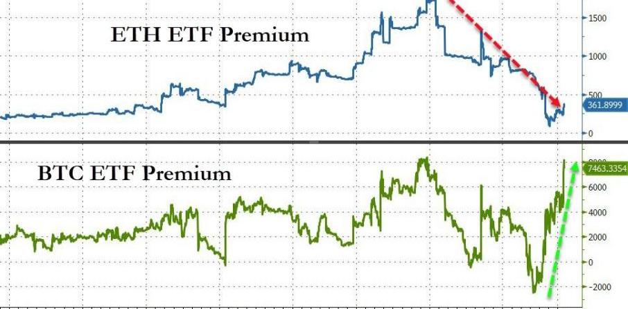 值得注意的是,比特幣和以太坊的ETF溢價正出現背離,前者的溢價不斷上升,而后者的溢價隨著現金流入而縮小。也就是說,市場更看好比特幣,比特幣在加密貨幣中表現也更出色。