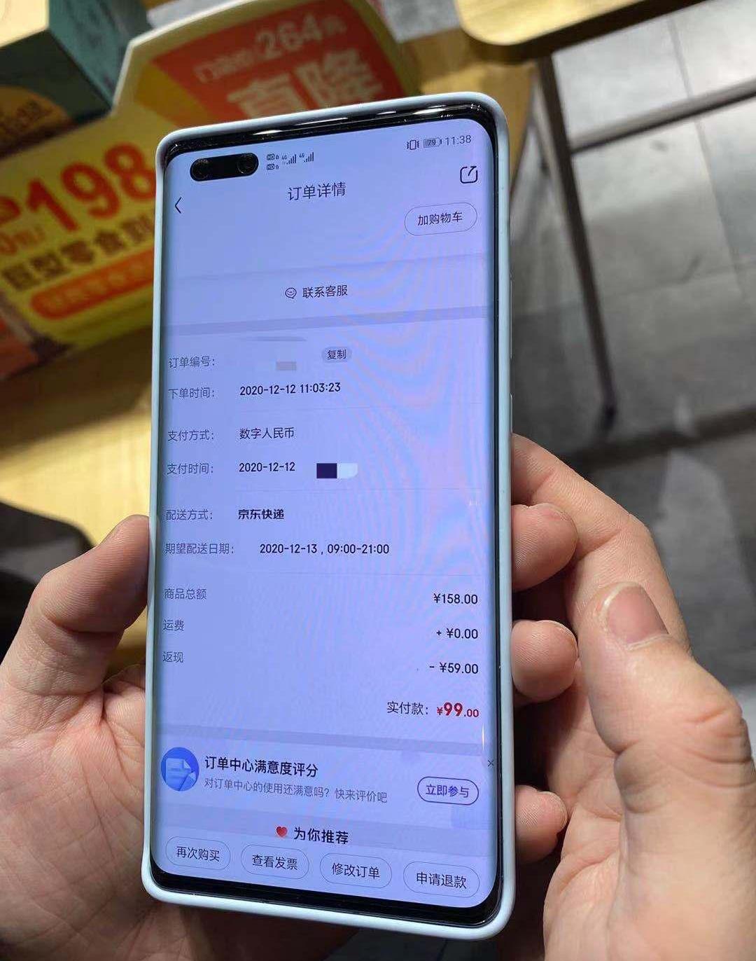 據了解,全國首單電商平臺數字人民幣消費誕生于11日20:00:02,來自蘇州的一位90后消費者在京東商城下單,并通過數字人民幣支付,支付過程耗時僅0.5秒,與現有支付方式體驗一致。