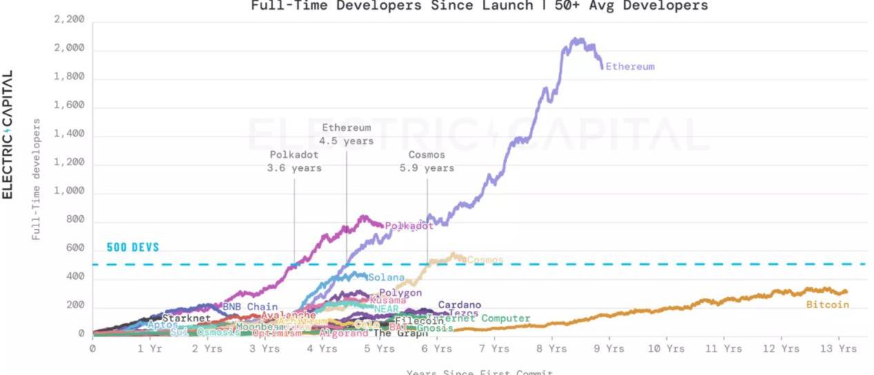 多年來圍繞?EVM?建立起來的網絡效應,使得這些新系統中的任何一個都不太可能超越它。正如?2022?年?ElectricCapital?開發者報告中所寫,以太坊無疑是最活躍的開發者社區。因此,使用?EVM?的執行層將在未來發揮重要作用。
