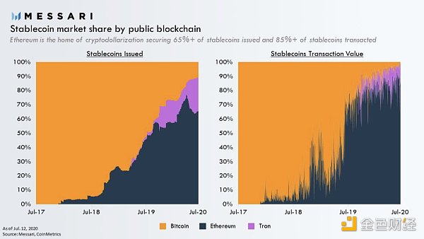 其中的以太坊是最受歡迎的。來自Messari的數據顯示,以太坊占據了所有穩定幣使用量的65%。此外,它還占據了穩定幣交易額的85%以上