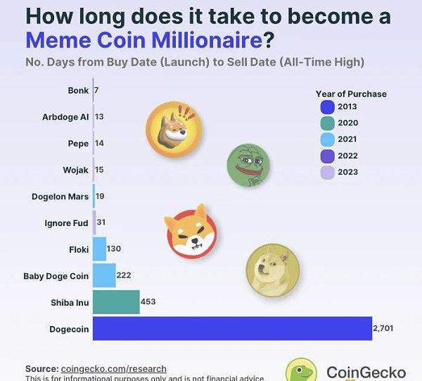 如果買家在?MemeCoin?剛火之前買入,放棄短期獲利機會繼續?Hold,則靠?MemeCoin?中致富幾率大大增加。例如,如果在“屎幣”剛剛推出時花費?11.87?美元買入,投資者可能在?1?年零?3?個月內成為?MemeCoin?百萬富翁。
