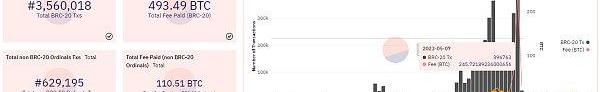 目前,BRC-20總計支出的交易費用大約493枚比特幣,其中245枚都是在最近24個小時內花費的,占到了BRC-20誕生以來的支出費用的49.6%