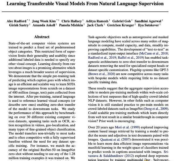 當時,OpenAI發表了背后關鍵模型CLIP的論文。論文中顯示,CLIP在4億個圖像-文本對上進行了預訓練,在沒有精細調整的情況下,最終在各種多模態基準中實現高性能。