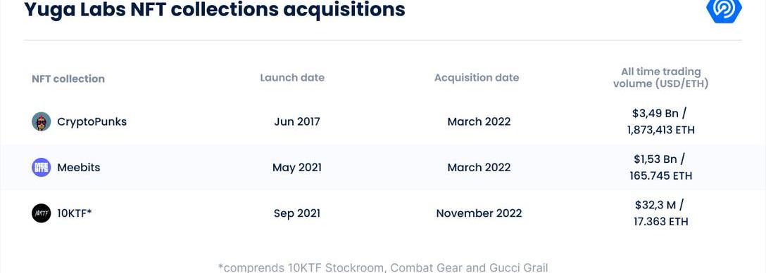 YugaLabs于2021年3月從LarvaLabs手中收購了CryptoPunks和Meebits的IP,當時成為了頭條新聞。此次收購大幅提高了YugaLabs在NFT行業中的影響力,因為這兩個NFT項目當時的估值為24.2億美元和3.7億美元。因此,在收購后,到2022年3月底,YugaLabs的NFT版圖的估值增至81億美元,占以太坊前100個NFT項目的42.6%。
