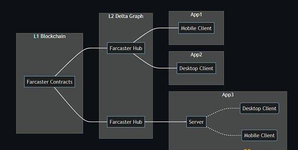 盡管Farcaster在其技術堆棧的一部分上利用了Ethereum,但它并沒有在區塊鏈上托管整個社交網絡。相反,FarcasterID在Ethereum上注冊,而其社交圖譜和內容則托管在稱為Hubs的節點網絡上。這些Hubs確保網絡的一致性,因為它們復制所有數據和簽名的消息。Farcaster協議還會修剪消息,使Hubs變得輕量化,提高了協議的去中心化程度。