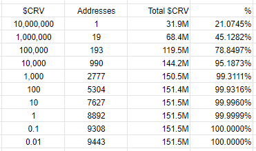 一共有15150萬CRV——即總量的5%,可以在1年內逐步分配給LP。目前只有990個地址獲得了超過10000個CRV,其中某巨鯨占據了最大份額,取得了21%的早期CRV獎勵。