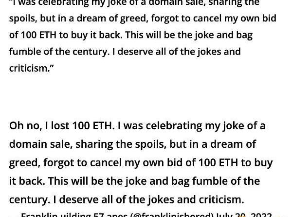然而,在他的ENS域實際得到了1.9ETH的出價后,Franklin立即接受了出價,但忘記收回他事先提出的100ETH出價。因為玩笑和貪婪,Franklin損失了100ETH。