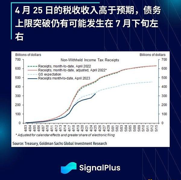 在方面,昨天共和黨控制的眾議院通過了債務上限立法,試圖在未來12個月內將債務上限提高1.5萬億美元,但這在民主黨掌控的參議院根本沒有通過的機會,顯示在債務上限問題上漫長的國會邊緣政策之路正要開始。好消息是,美國財政部稅收收入在4月25日超出預期,僅同比下降14%?,而不是原先預估的-28%和本月早些時候顯示的-35%?,這可能意味著最終債務上限的突破時間點將在7月左右,而不是最糟情況下的5月下旬/6月初。