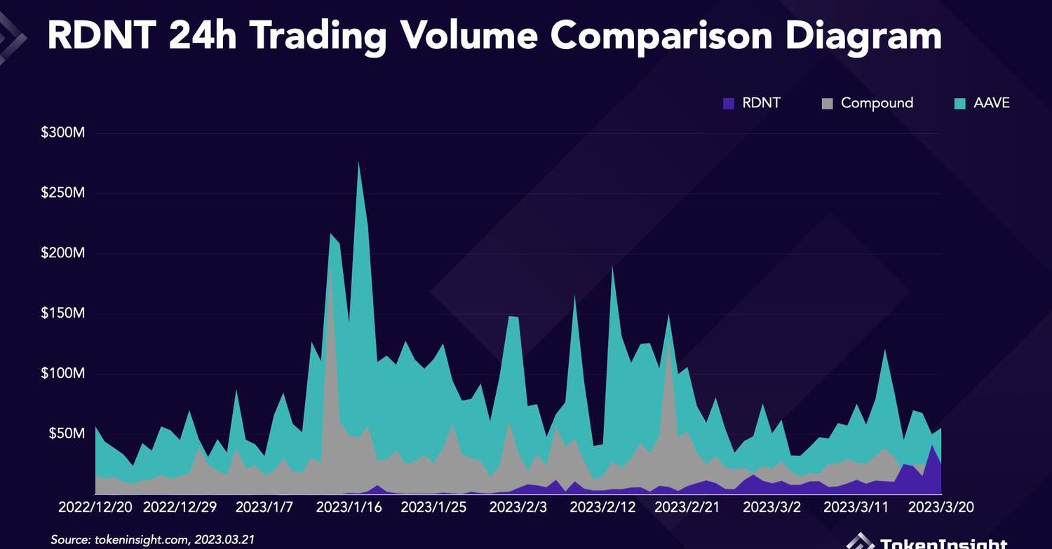 此外,從交易數據上來看,$RDNT的24h交易量從2023年年初一直持續上漲,從不到10萬美元上漲到最高4,000萬美元。但根據3月20日的最新數據,$RDNT當天的24h交易量幾乎腰斬了一半,下降到約2,500萬美元。對比目前市場中的龍頭借貸協議AAVE和Compound,$RDNT目前的交易量與$COMP齊平,但和$AAVE還有很大差距。