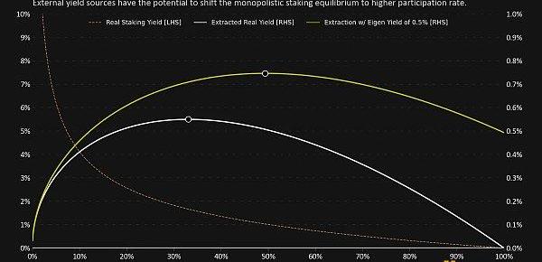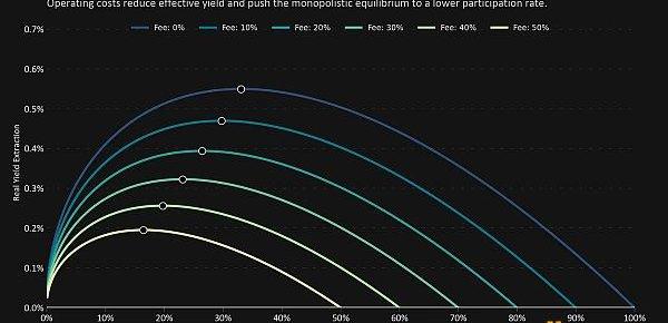從這個峰值偏離表示對非質押者的次最大稅收。如果我們期望一個壟斷性質押聯盟占據這部分供應份額,那么向其他人開放競爭將邏輯上推動質押均衡沿著曲線進一步擴展。因此,我們在上圖中看到的峰值,約為33%,可以視為長期內自由市場可能推動質押參與率的最低水平。
