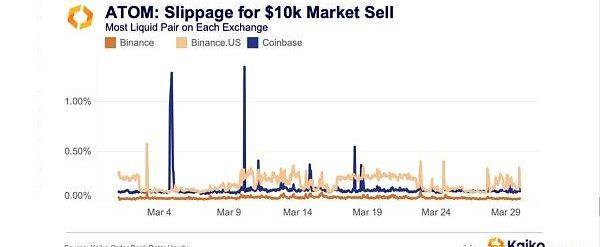 這自然吸引了頻繁交易的機構。幣安的小幣種流動性也非常深。下面是一個表格,顯示了一個名為?ATOM?的市值排名前?25?的代幣的模擬銷售價值為?10,?000?美元的滑點,該代幣在這三個交易所上都有交易。在?Binance?上的滑點為?0.03?%,從未超過?0.1?%;在?Coinbase?上的滑點為?0.11?%,在?Binance.US?上波動在?0.1?%和?0.3?%之間。