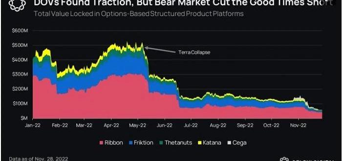 在牛市中,Solana在DeFi期權金庫(DOV)中鎖倉量超過了5億美元,直到熊市占據上風。與AMM的強制定價不同,Zeta等基于Solana區塊鏈的衍生品平臺通過利用ProjectSerum提供靈活的流動性和公允價值定價。另一方面,像Ribbon、Katana和Friktion這樣的DOV則在2022年增加了結構性產品市場的飽和度,雖然這些DOV最初以高額收益率和低感知風險吸引流動性提供者,但隨著時間的推移,它們的弱點也變得越來越明顯。