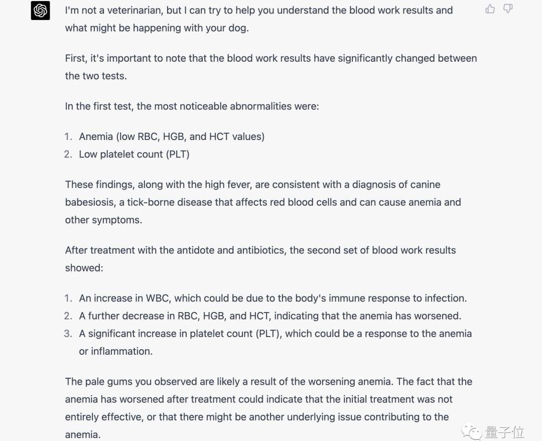 它首先開出了“我不是獸醫”的免責聲明,然后表示“可以試著幫助你分析血液報告,告訴你的狗可能發生了什么”。