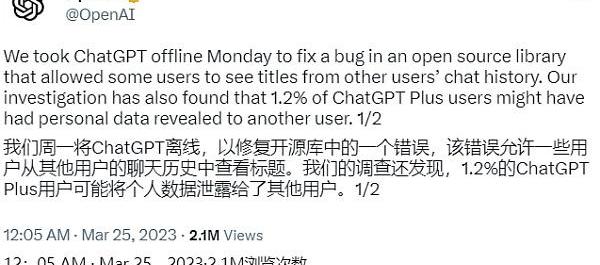 XRP/HKD-2.93%美國時間3月25日,OpenAI官方發布了3月20日ChatGPT臨時中斷服務的調查報告,并表示有1.2%的ChatGPTPlus用戶可能數據被泄露。