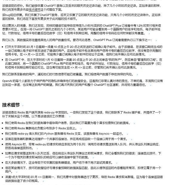 根據OpenAI官網公告表示,3月20日以前,一個名為Redis-py的開源庫中的錯誤造成了緩存問題,該問題會導致用戶可能看到其他人聊天記錄的片段,甚至會向一些活躍用戶顯示其他用戶信用卡的最后四位數字、到期日期、姓名、電子郵件地址和付款地址。