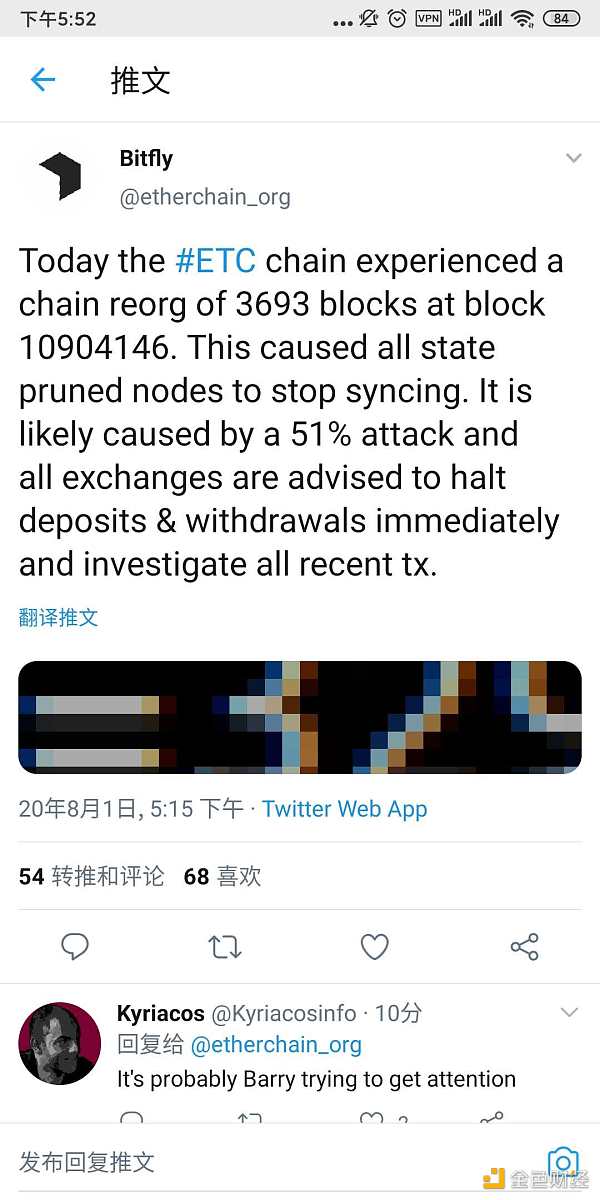但是奧地利區塊鏈公司Bitfly發推表示,ETC在區塊高度1090416處發生了3693個區塊的區塊重組,這導致所有修剪節點無法同步。這很可能是遭到了51%攻擊,因此建議所有交易所立即停止ETC的充提,并檢查最近的交易。在ETC無法出塊30分鐘時,Bitfly表示,ETC的CoreGeth節點也已經無法同步30分鐘了,兩者可能有關。
