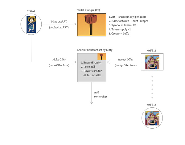 現在你明白了吧。創作者鑄造一個 LexART 通證,使用該通證提供一個報價,并以同樣的通證收取版稅。買方接受報價并成為一個收藏者,并與創作者一起收取版稅。