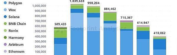 2月總活躍用戶下降為150萬,主要集中在Solana,Polygon和Hive,這個數據已經從去年十月250萬的高點出現了4個月的連續下降,這也許是因為從去年底以來,鏈游市場再無出現類似于StepN這樣的爆款游戲有關,無法帶動存量用戶的活性。