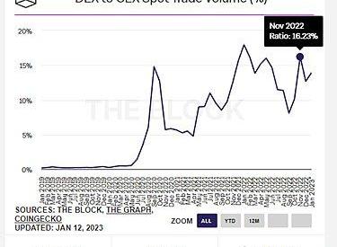 但我們可以看到的數據是,DEX的交易量在FTX暴雷后的幾天迅速翻倍,大家對于中心化機構的恐慌轉變成了對于去中心化金融協議的信任,所以,這個行業并不是沒有規則,而是在Crypto的世界,只有代碼才是規則,代碼即法律,我們沒有必要相信任何中心化機構,而更應該開源協議和智能合約帶給我們的安全感。這是DeFi下一輪的敘事之一,即取代現有的中心化金融機構。2020年的時候,因為交易挖礦、流動性挖礦等激勵方式,DEX交易量一度占到了CEX交易量的15%,而經過兩輪下跌以后,已經不再有足夠豐富的挖礦代幣激勵,但我們看到最近DEX的交易量又回升到了15%左右,這是符合新興技術的發展曲線的,即在泡沫消退后,有越來越多的人開始把DEX作為日常交易的場所,去替代CEX的功能。