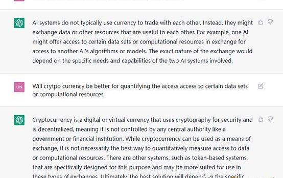 如果AI之間進行交易,它們會用法幣還是數字貨幣來交換?我曾向ChatGPT問了這個問題,他回答我說,用Token對數據訪問的權限進行量化定價是一個相比于傳統貨幣更好的方案。